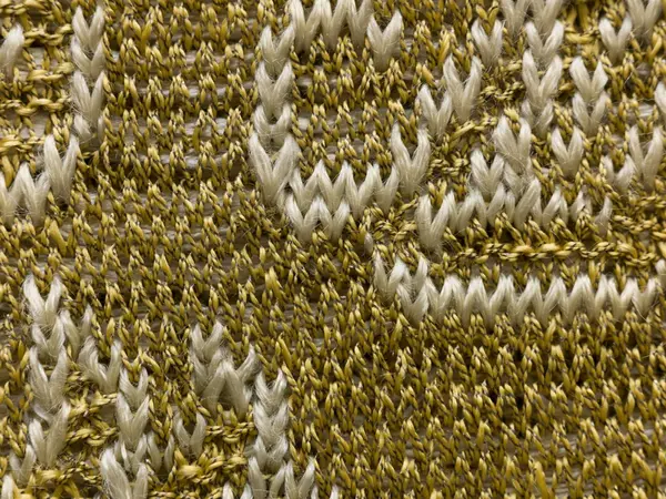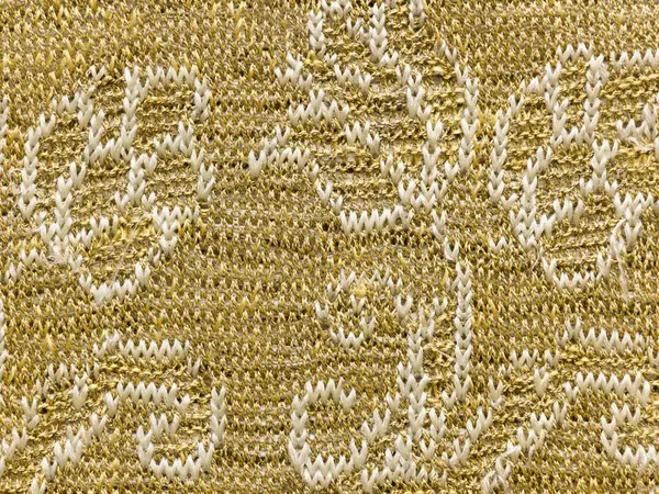 Nordiska museets föremål. Tröja av gult silke slätstickad med instickade mönster i aviga maskor i form av svängda tulpaner med konturer av vitt garn, de aviga maskorna inne i mönst...