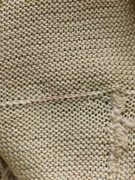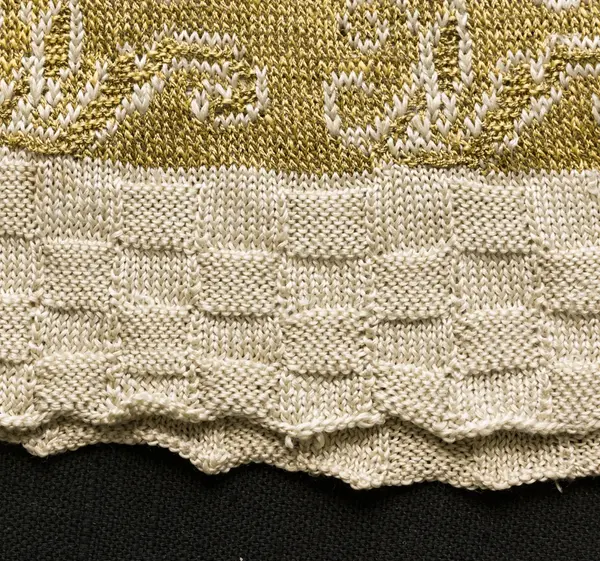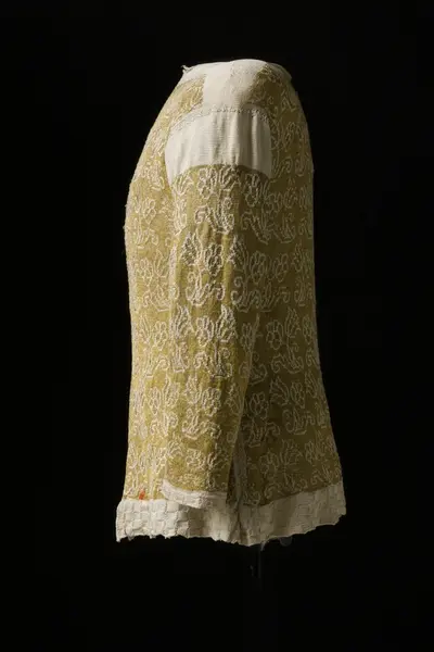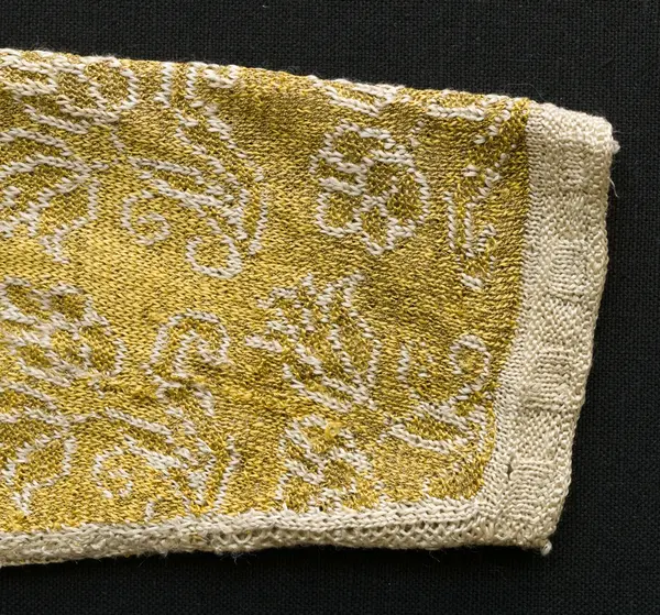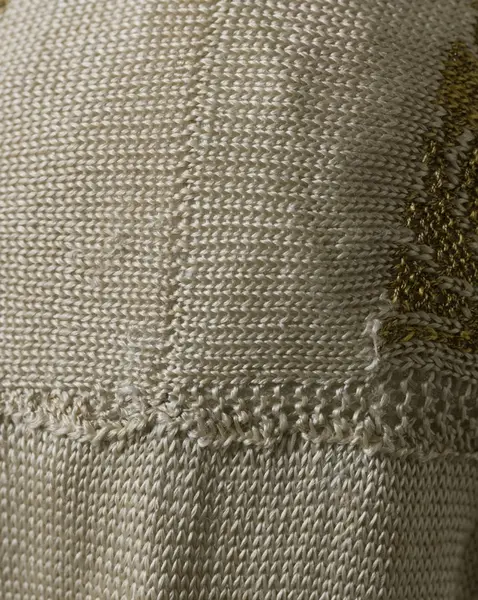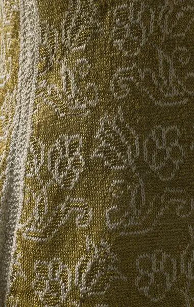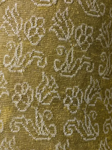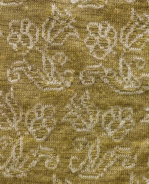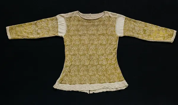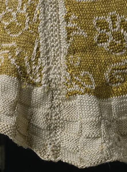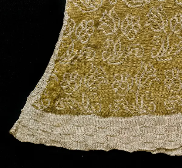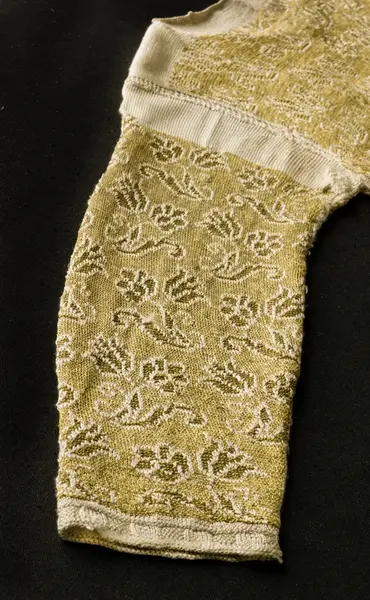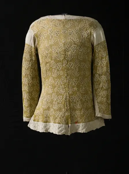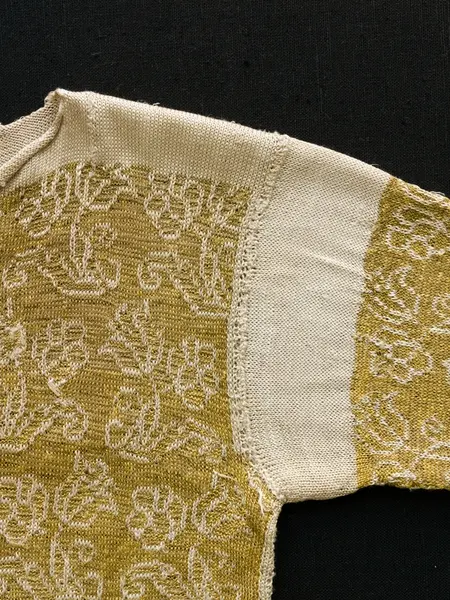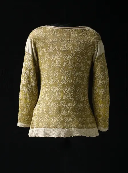 Nordiska museets föremål. Tröja av gult silke slätstickad med instickade mönster i aviga maskor i form av svängda tulpaner med konturer av vitt garn, de aviga maskorna inne i mönstret är i silke omspunnnet med guldtråd. Nederkanten rutstickad med det vita garnet. Vitt även i ärmkant, kring halsen och på ärmkullen. Tröjan stickad i 5 delar, stickad fram och tillbaka, inte runt. Det vita garnet bildar långa flotteringar på avigan. Det vita garnet kan möjligen ha varit ljusblått från början såsom är fallet med den tröja, nu i Victoria&Albert museum, som är mycket lik denna. Tröjan har sytts ihop fram men har ursprungligen varit helt öppen och haft någon form av knäppning NM inv.nr 221941