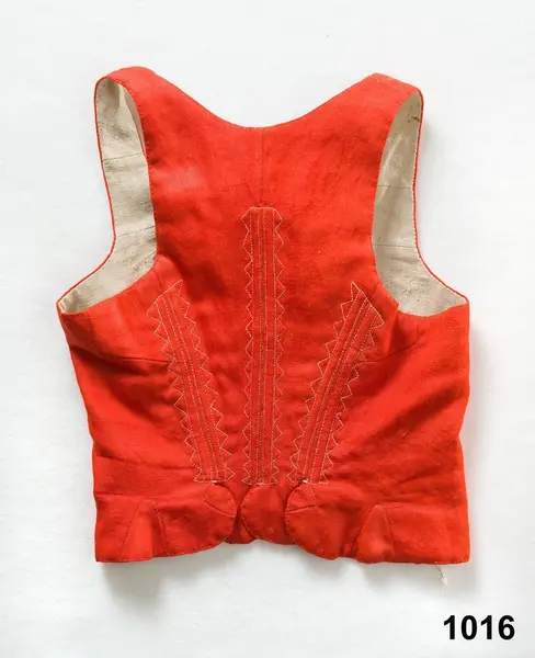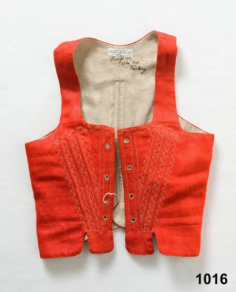 "1016 Rödt lif fr. Tunge sn. Ale hd. Västergötland. Begagn. ss. 1012 [=midsommardagen 1795 af Annika Andersdotter. 1012-1018 var bruddrägt. Ink. ss. 1012 [=Ink. ss. 1010 [=gm fröken E. Schmidt på Haneström (Lilla Edet). Ank. 24/4 1873] jämte 1013-1021 = 12 rdr]. Bil. Schmidt 3."