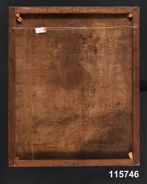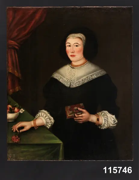 "Ung dam från 1600-talets senare del. Knäfig. stående i vänd åt v. vid ett med en grön duk öfvertäckt bord och hållande i sin upplyftade v. hand en andaktsbok/psalmbok. I svart dräkt med hvit spetskrage, hals- och armband i guld. Af okänd konstnär. D. H. 105 B. 0.85. Utan ram."