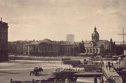Telefontornet till Stockholms Allmänna Telefonaktiebolags telefonstation Malmskillnadsgatan 30, år 1886. Tryckt bild. Bild tagen från Skeppsbron nedanför Slottsbacken. Vy med Telefontornet i fonden. Här syns även det äldre operahuset som ritades av Erik Palmstedt och uppfördes 1782. Huset revs 1892 för att ersättas av ett modernare operahus.