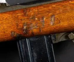 - Enligt uppgift från Bengt-Arne Person 1991 har detta maskingevär enl. givaren använts av en dansk flykting som var motståndsman i Danmark under andra världskriget. Flyktingen blev omhändertagen i Varberg. Gåva 1971 av hr. Simon Årholm, Varberg.