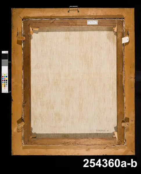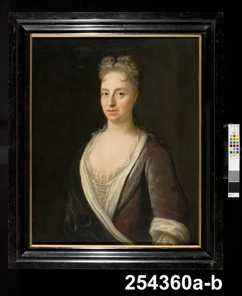 "Porträtt, oljemålning på duk i svart ram med inre guldkant, föreställande Baltzar Grills fru, Elisabeth Faltz (1653-1720), på spännramens baksida i svart skrift 'Grill, Riks Guardiens Fru, Elisabeth Faltz. H 100 cm, Br 83,5 cm (rammått). Renoverad 1957 hos konservator Svensson, Stockholm. Inköp 4/6 1957 Skajs Antikhandel."